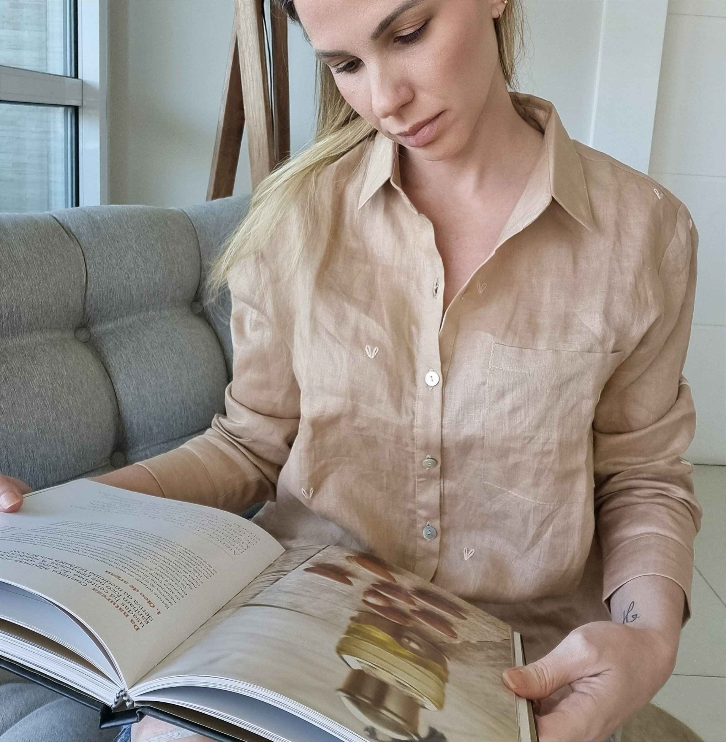 Camisa 100%linho com bordado de mini coraçoes na cor creme