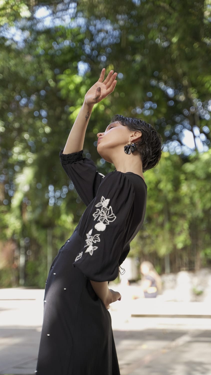 Vestido em viscose com abotoamento frontal, manga 3/4 com elástico, todo bordado à mão. Veste incrivelmente bem! Ajustado no busto e soltinho no quadril.